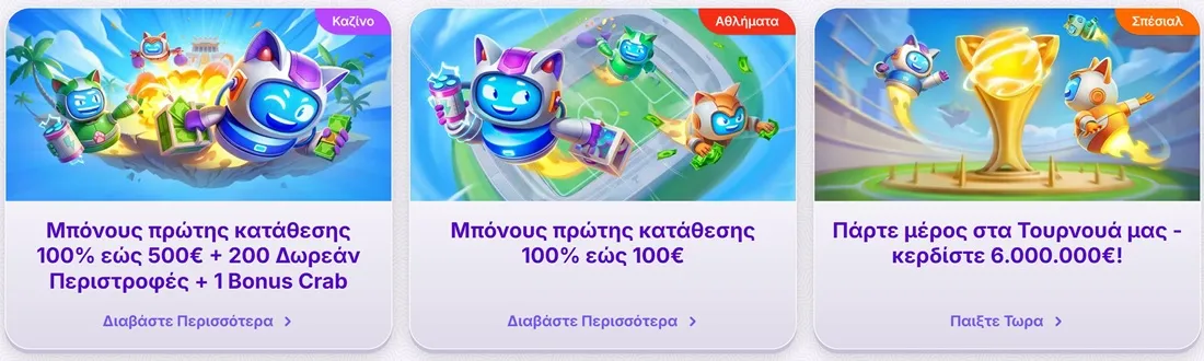 Για τους νέους χρήστες που θα ξεκινήσουν να παίζουν σε αυτό τον ιστότοπο , θα συναντήσουν μεγάλα δώρα απο την πρώτη στιγμή! Αρχικά μπορείτε να επιλέξετε ανάμεσα στο δώρο για το καζίνο που είναι 100% έως 500 ευρώ + 200 δωρεάν περιστροφές + 1 Bonus Crab η στον στοιχηματισμό που είναι αντίστοιχα 100% για καταθέσεις έως 100 ευρώ. Σε συνέχεια υπάρχουν μεγάλα τουρνουά με έπαθλα χιλιάδων ευρώ καθώς και η δυνατότητα να γίνεται VIP μέλος με έξτρα παροχές όπως Προσωπικό VIP μάνατζερ , Ειδικές προσφορές, CashBack και άλλα.